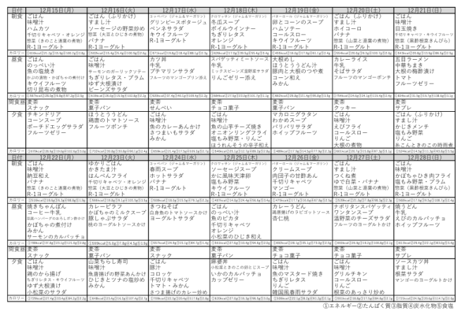 たのしい給食 バラエティーなメニューで、魚沼学園の子ども達・魚沼更生園の利用者達が、最も楽しみにしている給食です。 色んな食材を使いバランスの良い食事内容で、みんなの健康管理を助ける給食を作り続けています。 給食だより 令和7年12月15日~12月28日 週間献立表(12月15日~12月28日)